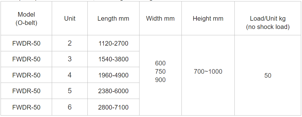 •Transport speed as 10-35m/min, Max weight as 50kgs/unit.